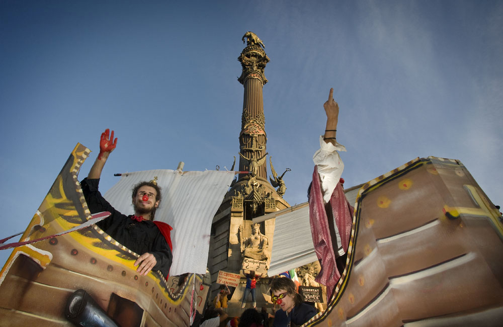 La Niña, la Pinta y la Santa Maria con a borde los reyes Fernando e Isabel han desfilado por las Ramblas al lado de Endesa, Gas Natural, la Union Europea y el Capitalismo (encarnado por un chico elegante que desde lo alto de sus zancos impartía ordenes y controlaba la situación). Delante de la estatua de Colon al final de las Ramblas, parada obligada de la mani, colgaban pancartas que iban desde las denuncias del golpe de estado en Honduras hasta los derechos del pueblo saharaui y por el altavoz se oían nombres como el de Túpac Amaru o el movimiento Zapatista (activo en Barcelona). Mil historias diferentes que han encontrado unanimidad en la última frase del discurso de los organizadores. “Si el enemigo está globalizado, a globalizar la rebeldía”.