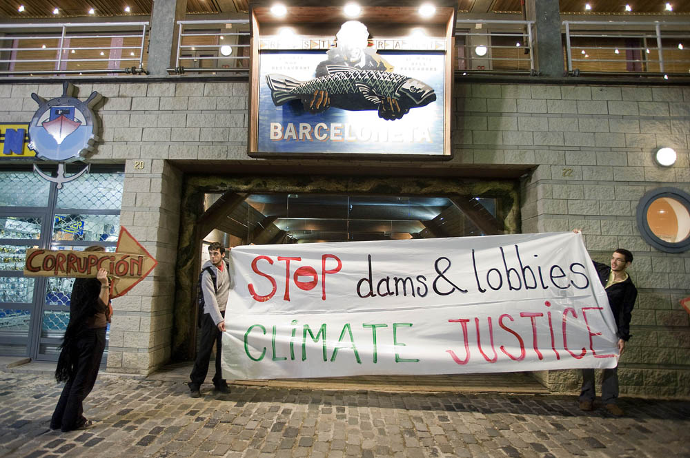 Una veintena de activistas de la campaña “El clima no está en venda” y de la organización International Rivers se han manifestado alrededor de las ocho de la tarde de hoy delante del restaurante Barceloneta del barrio homónimo, donde los representantes de las mayores corporaciones hidroeléctricas estaban reunidos con delegados de las negociaciones sobre cambio climático de diferentes países en un espacio paralelo a los oficiales de las jornadas pre Copenhague que están teniendo lugar estos días en la ciudad condal.