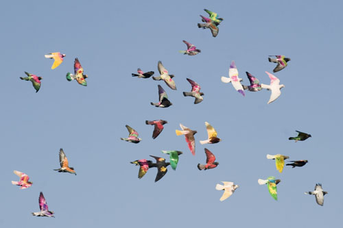 Nada más abrir las numerosas puertecitas de sus cajas el cielo se tiñe del rojo, rosa, verde, azul o amarillo del plumaje de Tiro Fijo, Duro de pelar, Pitingo y Pluma Blanca (entre otros). Son sus palomos de competición y los reales protagonistas del evento. Solo cuando todos los palomos están ya altos en el cielo y se han reunido en grupos, Jose y sus compañeros abren la caja de la hembra. Es la única cuyo plumaje no está teñido y la única en llevar dos plumas blancas postizas. Los machos han aprendido desde pequeños a reconocer el detalle y cuando la ven van directos a por ella.