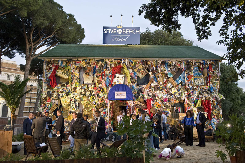 Durante tres días, entre el 3 y el 7 de este mes, Schult, acompañado por una veintena de colaboradores, construió en el centro de Roma “que representa todas las ciudades” un hotel desplazable de dos plantas y de unos ocho metros utilizando 12.000 kilos de residuos inórganicos encontrados casi en su totalidad por las playas de nuestro continente. Si la construcción fue casi istantanea, tanto el trabajo de recolección llevado a cabo gracias a la campaña Save the Beach –impulsada por la cerveza Coronita en 2009- como la planificación de la construcción, llevaron medio año de trabajo.