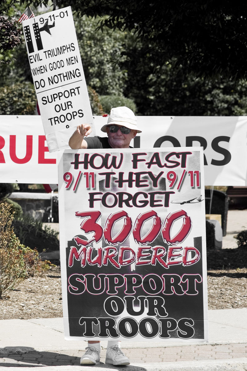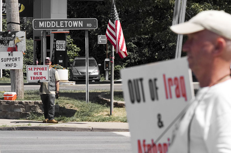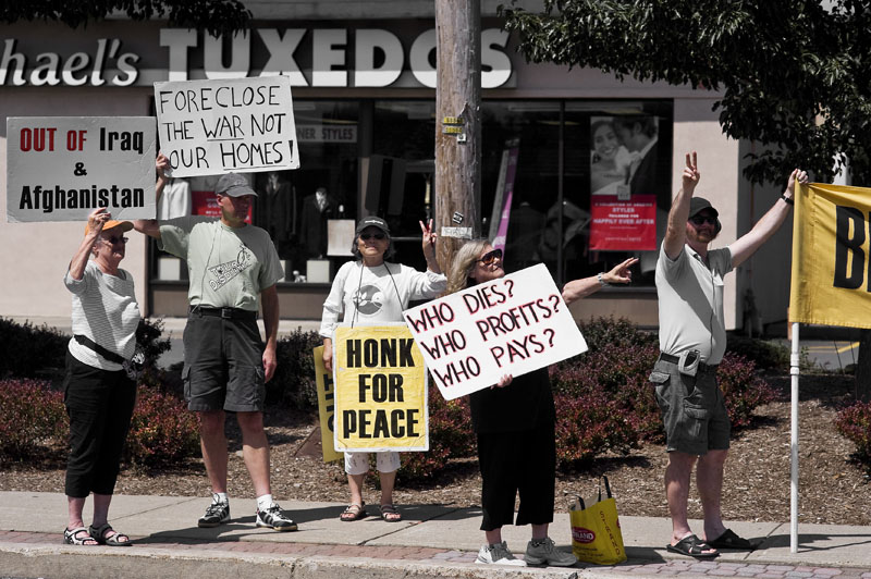 Len, Nancy y la veintena de compañer@s, much@s docentes universitari@s y veteranos, que estaban el otro día ni por un momento pensaron quitar el foco de los transeuntes para mandarles a parir, como Gianluca y yo teníamos ganas, en el fondo, de hacer, sino que aprovecharon cada semáforo para entregar a la gente los folletos informativos sobre los muertos estadounidenses y locales en las últimas guerras emprendidas por su governo junto con los gastos que éstas implican para l@s ciudadan@s del contado de Rockland (hasta el momento 22 mil dólares por familia desde el comienzo de la guerra).