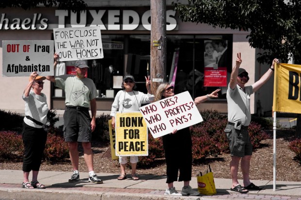 Cada un@ escoge una esquina del cruce y una pancarta. Las hay contra la guerra en Iraq y Afghanistan, en favor de la paz y de la retirada de las las tropas estadounidenses de estos países y luego muchas, y en diferentes idiomas, que sólo rezan “Honk for peace” (toca tu bocina por la paz).