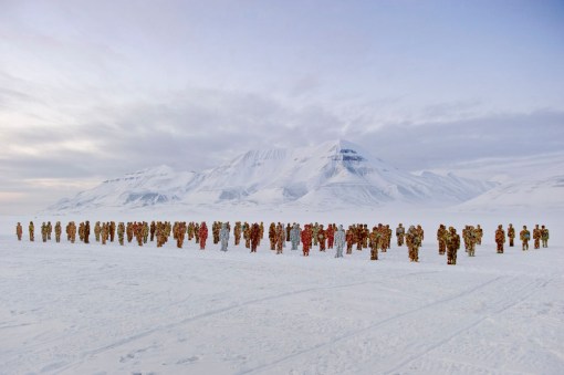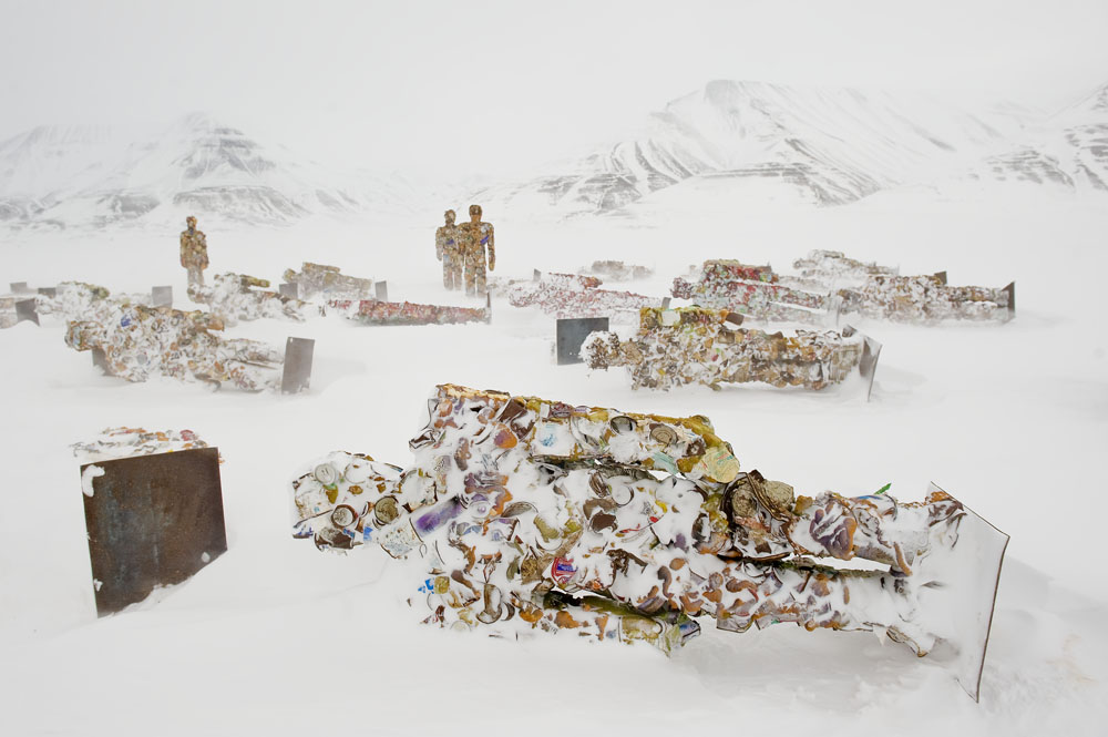 HA Schult is the first major environmental artist and has been travelling around the world with his collection of trash people since 1996. They are now installed on the ice at Longyerarbyen, Norway.